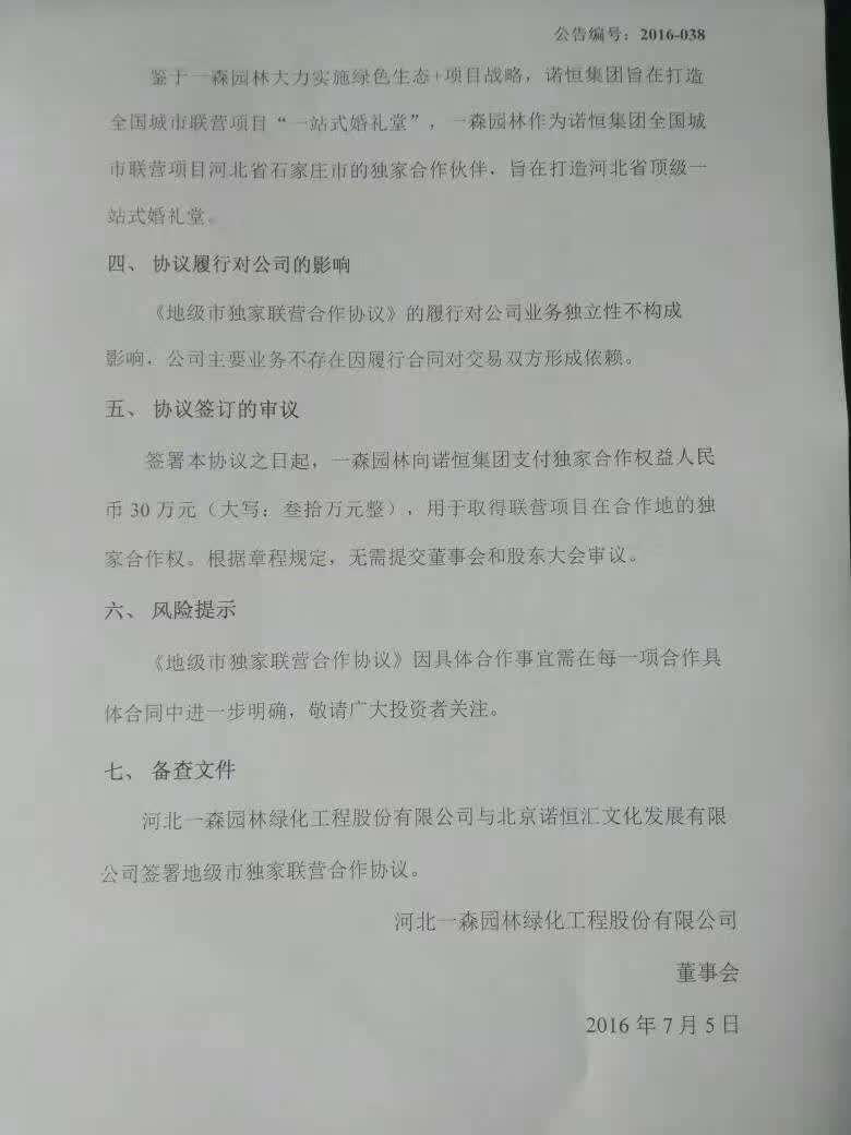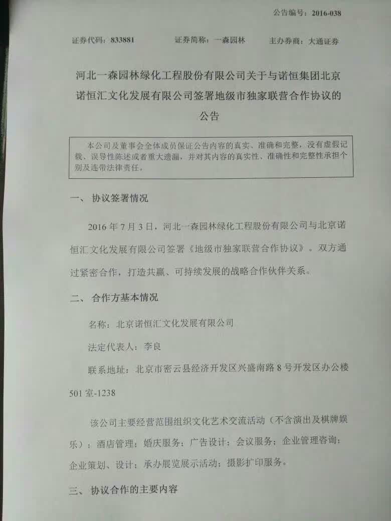 河北一森園林綠化工程股份有限公司關(guān)于與諾恒集團北京諾恒匯文化發(fā)展有限公司簽署地級市獨家聯(lián)營合作協(xié)議公告